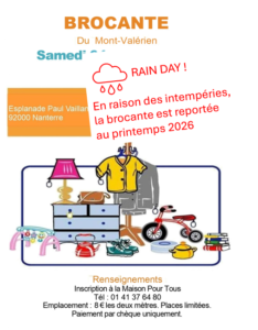 Report au printemps 2026 de la brocante initialement prévue le samedi 4 octobre 2025 Report de la brocante en raison des intempéries prévues ce samedi 4 octobre. Nous en sommes navrés et RDV au printemps 2026 Renseignements : 01 41 37 64 80
